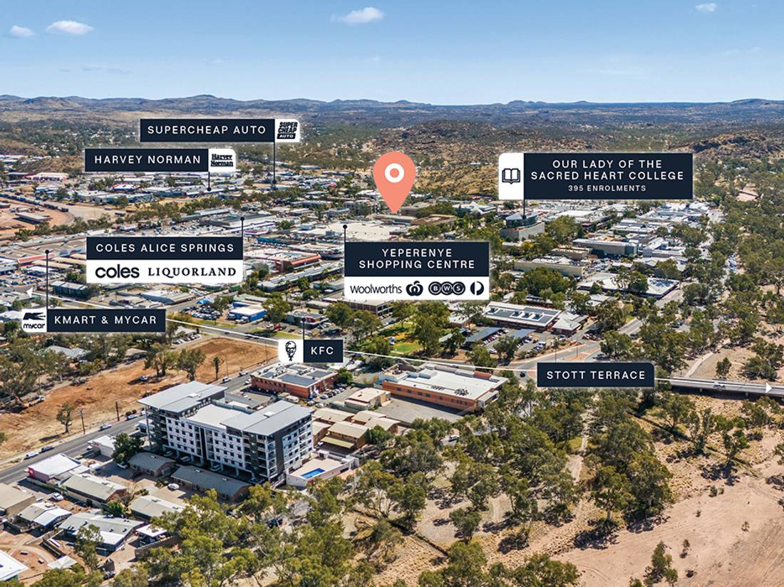 + CBD location with convenient access to Yeperenye Shopping Centre, anchored by Woolworths, BWS, Australia Post and within 1km* of Coles, Harvey Norman, Repco, Supercheap, MyCar and Kmart