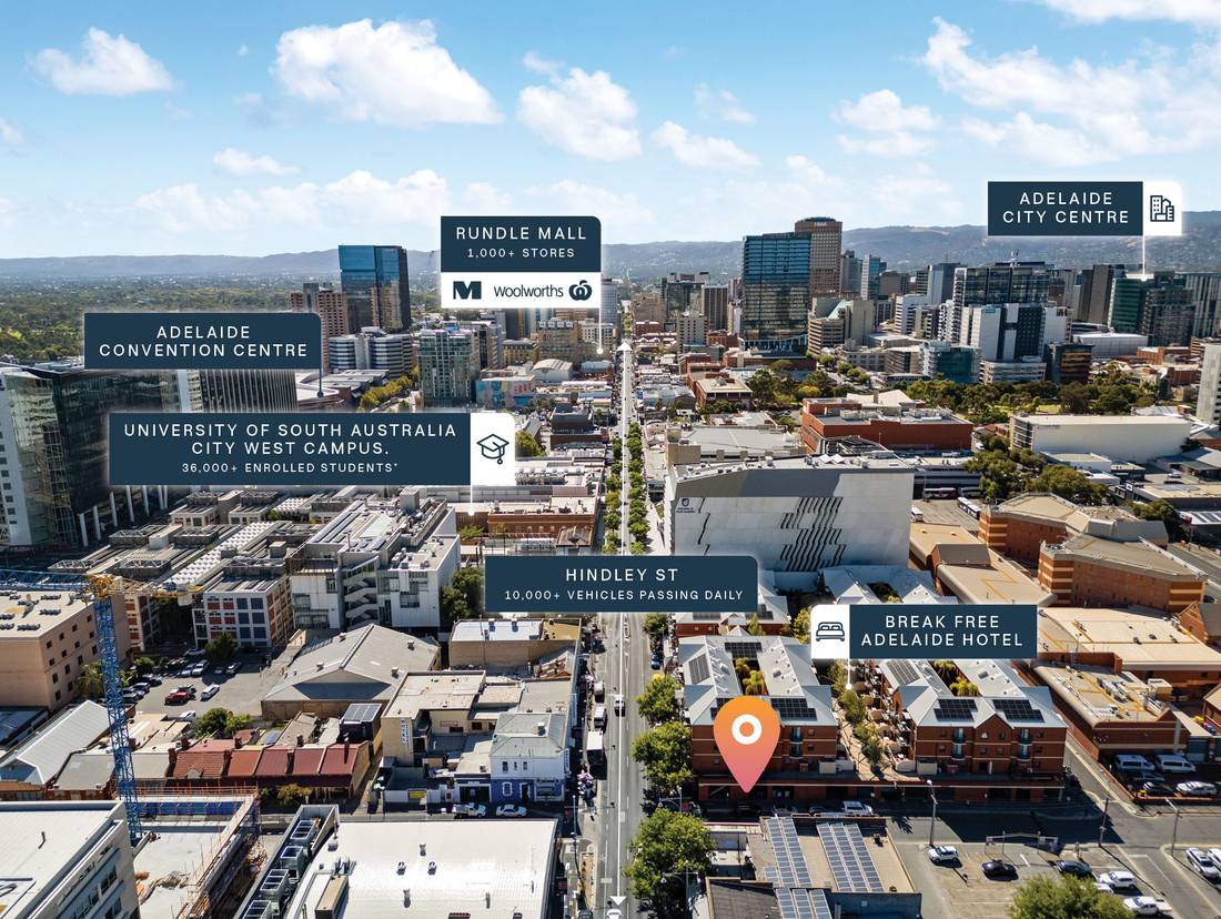 + High-exposure site situated on ground floor of BreakFree Adelaide Hotel and opposite the University of South Australia, City West Campus. UNISA currently supports over 36,000 enrolled students*