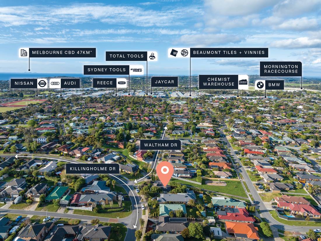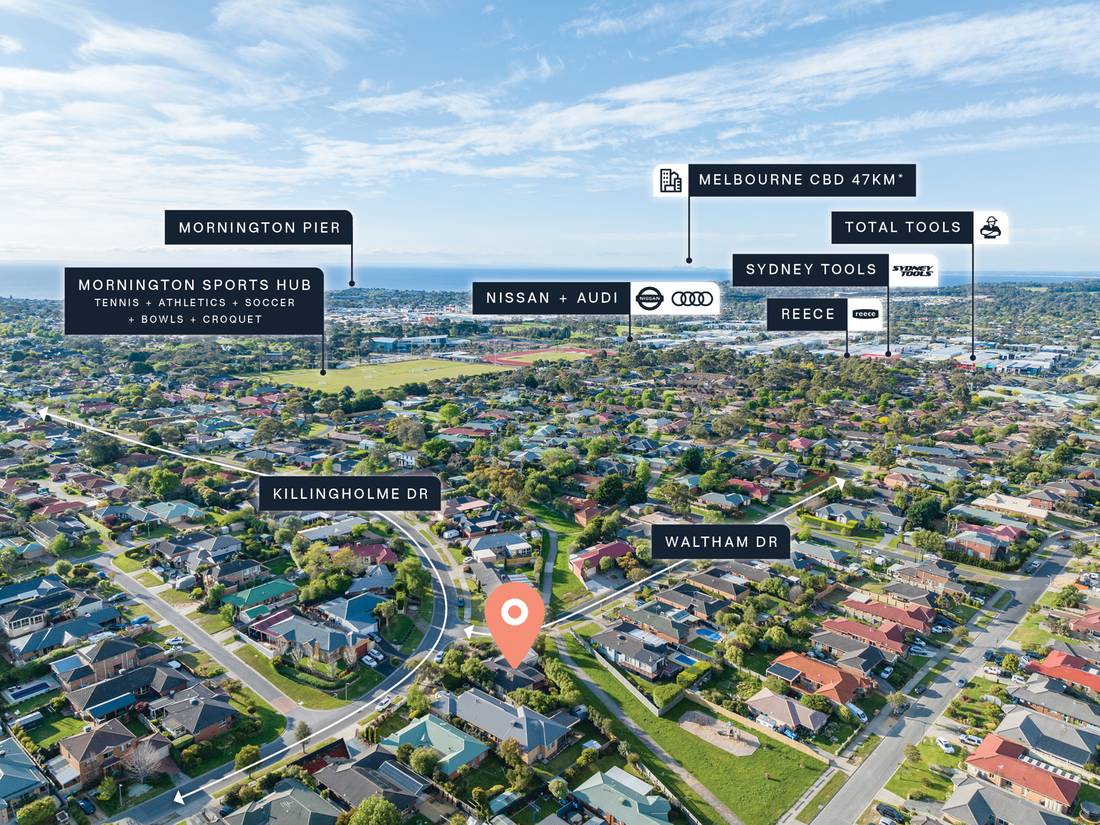 + Conveniently positioned just 700m* from Mornington’s premier industrial precinct (Chemist Warehouse, Coles, Beaumont Tiles, Tools, BMW, Mercedes-Benz, Audi) and 850m* from the Woolworths and Dan Murphy’s anchored Bentons Square Shopping Centre.