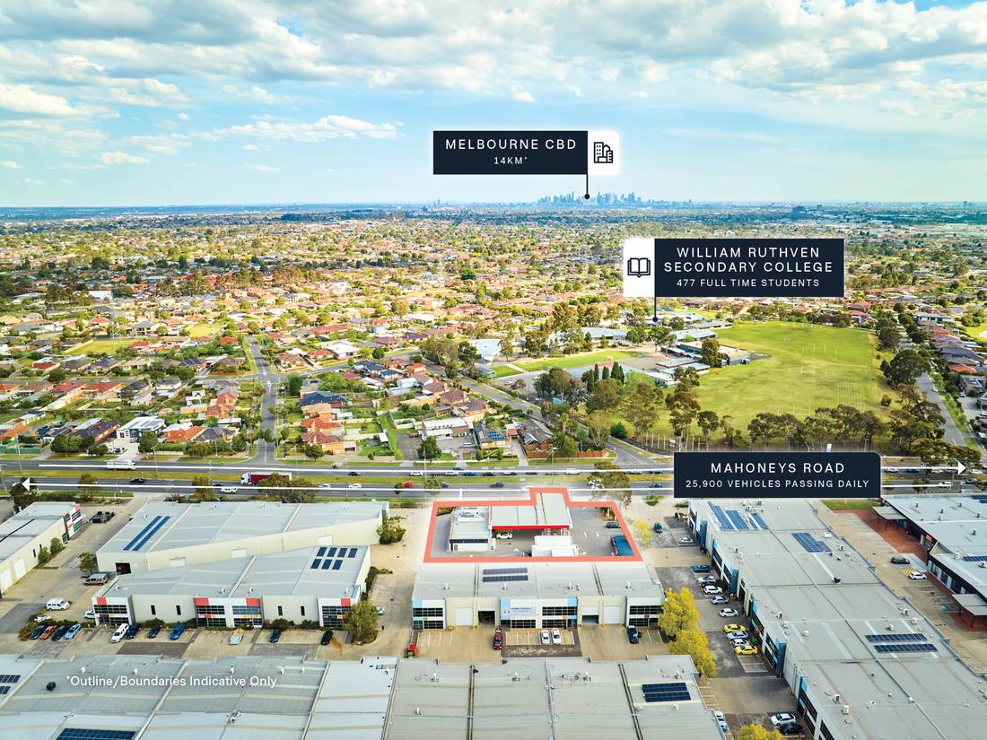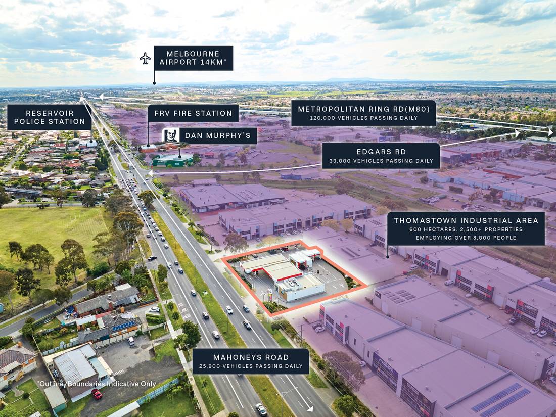 + Strategically positioned 2,884 sqm* site, boasting 59m* prime frontage and exposure to 25,900* vehicles daily*** along Mahoneys Road—an essential east–west arterial that connects the Metropolitan Ring Road (M80) with High Street and Dalton Road.***