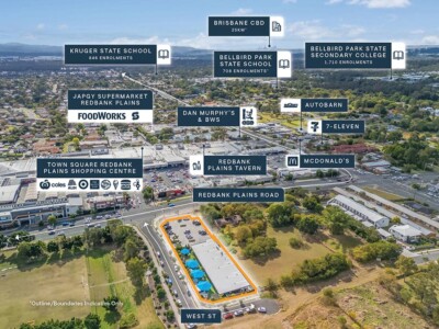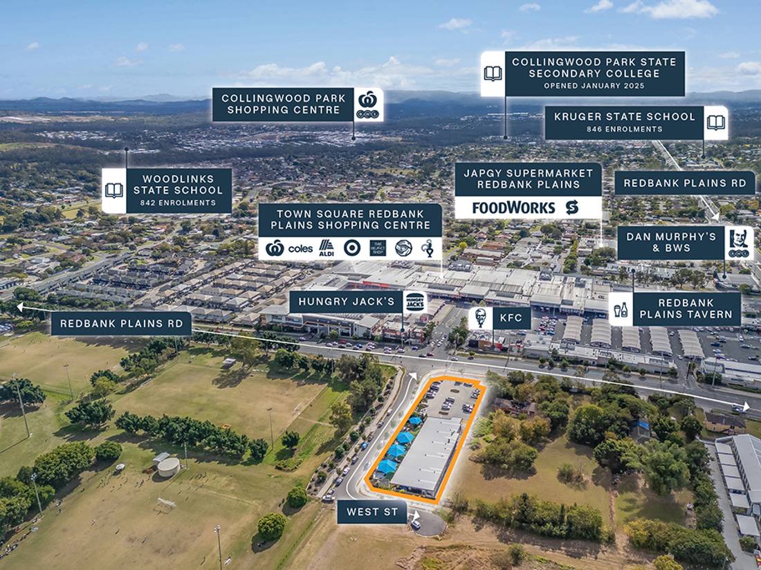 + Substantial 3,446sqm* corner landholding situated directly opposite Redbank Plains Shopping Centre, anchored by Coles, Woolworths, ALDI, Target, KFC & Hungry Jack’s The Reject Shop & supported by 50+ specialty retailers